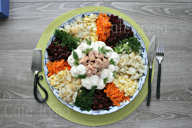 Салат из старых времен,когда банка консервированного лосося была большим дефицитом...